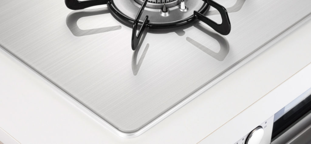 前面フェイスは、ヘアライン仕上げで華やかな雰囲気。グリル取っ手から左右の操作ボタンまで一直線にして、すっきりとしたデザインに仕上げています。