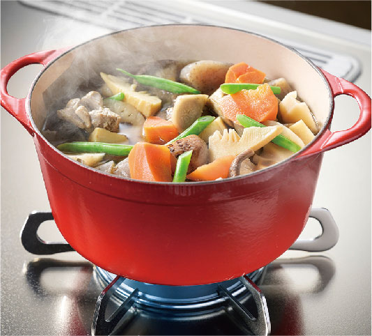 火力を自動調節して焦げつきや吹きこぼれを抑えます。火力調節つまみが最弱位置で煮込み機能が作動すると、通常の弱火よりもさらに弱火になる“極とろ火”状態になります。消費エネルギーも抑えられるため、省エネにもなります。