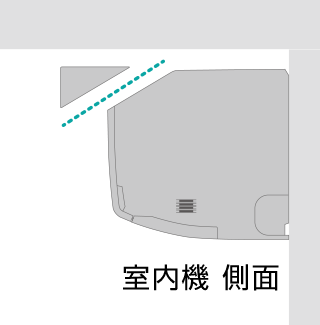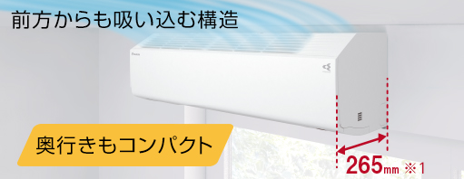 室内機の上部を斜めにカット。上方だけでなく前方からも空気を吸い込みます。